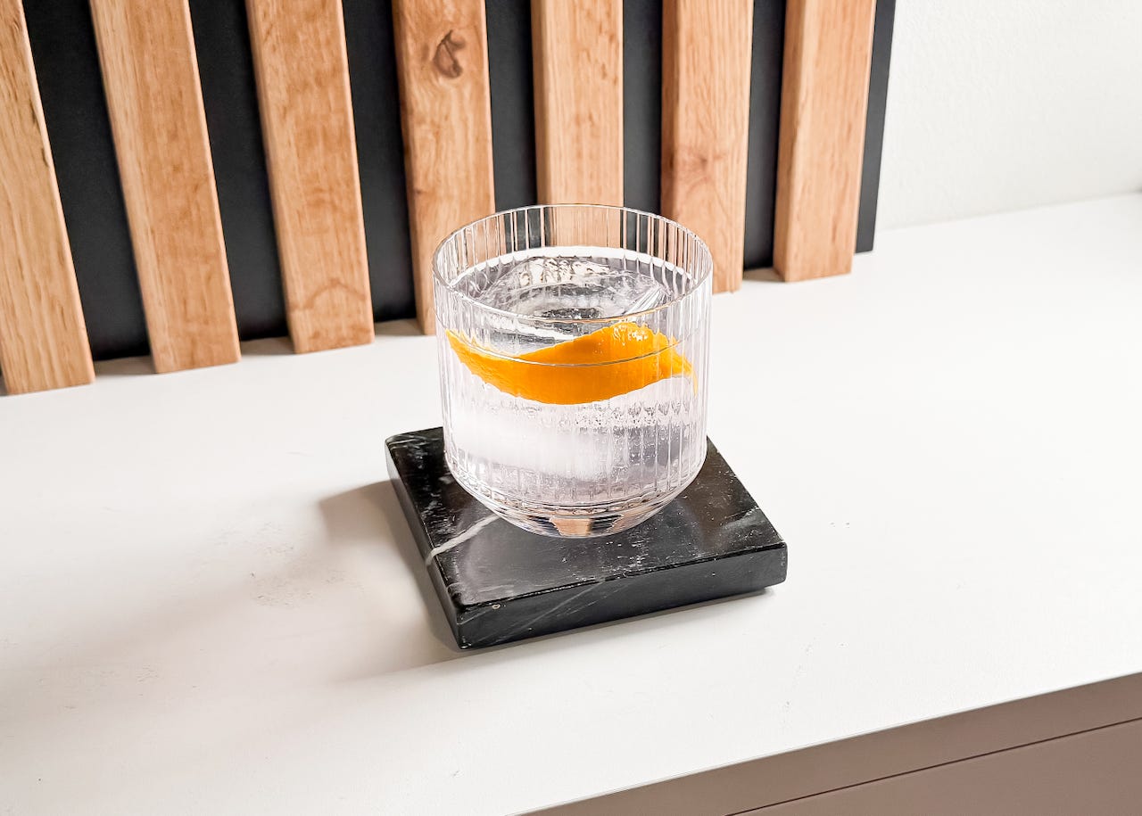 Moderní twist na Old Fashioned s bezovým likérem. Dvě verze: bourbonová a ginová, každá s jedinečným květinovým chuťovým profilem.